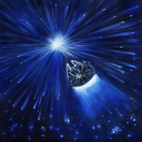 The Millenium Falcon flying off into hyperspace. Part of a diptych with Dreams of Stars: Binary Sunset. Can be also a standalone. The sides of the canvas are painted so it can be hanged without framing.
