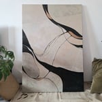 Original abstract painting on thick jute canvas 90x130 cm (approx. 35x51"), varnished and signed, made in 2024. Raw and natural aesthetic of the textured canvas complemented by elegant organic lines and shapes in glossy black, with accents in gold shiny paint.