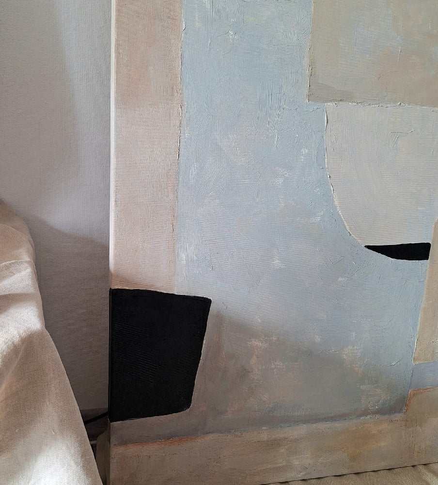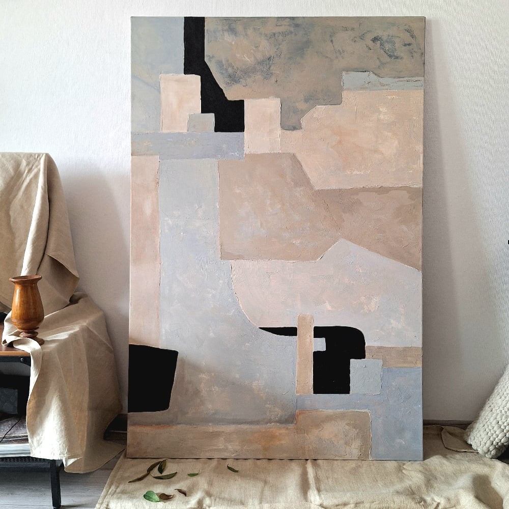 Original large abstract painting on canvas 100x150 cm (approx. 40x59"), varnished and signed, made in 2024. Bold geometric shapes for a pleasing minimalist composition. Structure of paint is visible, creating a subtle 3d effect.