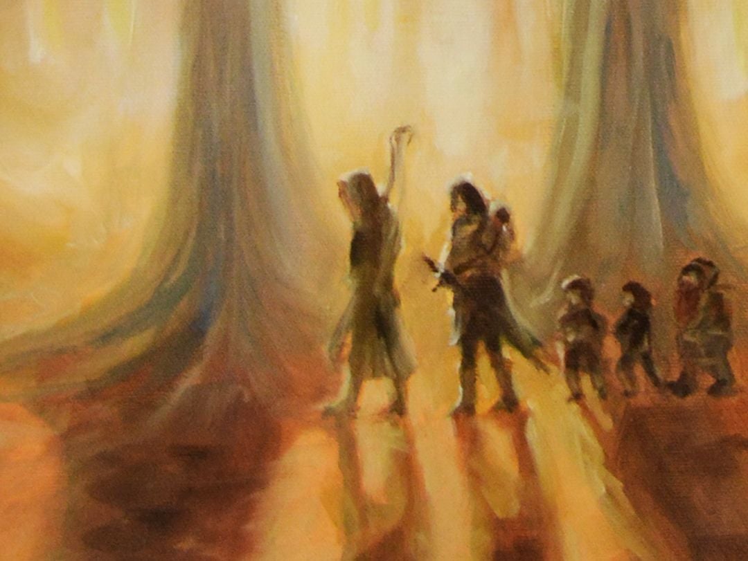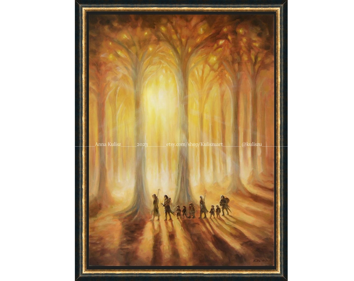 The Fellowship of the Ring, after losing Gandalf in the Mines of Moria, enter the Golden Wood of Lothlórien led by the elf Haldir.